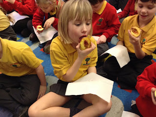 They have also started reading "James and the Giant Peach" by Roald Dahl, and will be doing various pieces of work linked to this story. Their first task was to taste and describe peaches - yummy!